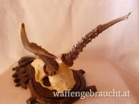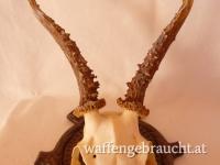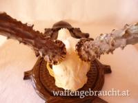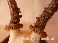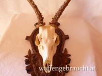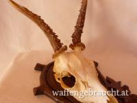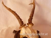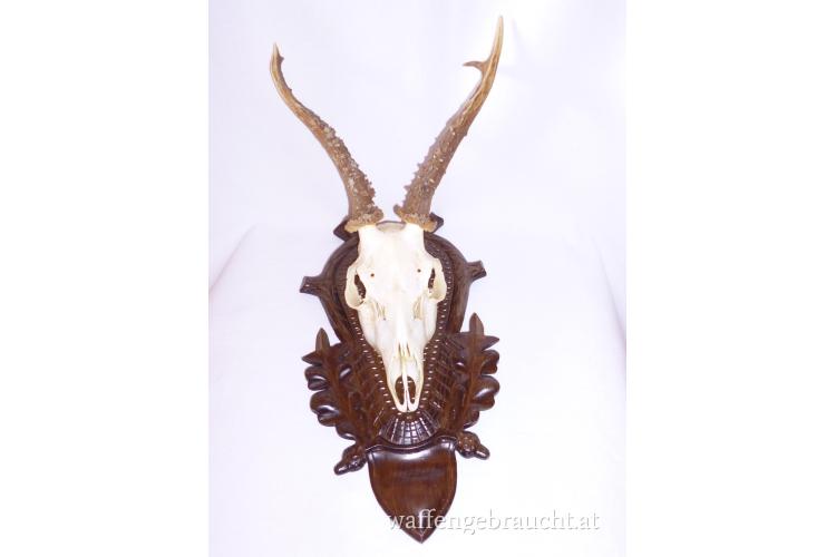 Nr. 12: Rehtrophäe, Rehgeweih, Geweihhöhe 19 cm, auf handgeschnitztem Schild aus Massivholz, VB 55,--