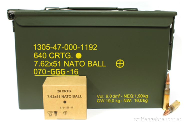 7.62 x 51 NATO BALL M80 GGG (.308 Win.) in der M2A1 Box 640 Stk.= 0,91 per Stk.