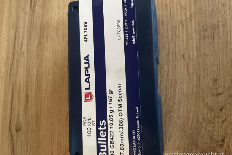 Biete eine angefangene Schachtel Lapua Scenar 167gr. OTM Geschosse für .308Win an.