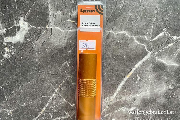 Einfach die Patrone in die Lyman Hülsenlehre fallen lassen und so die Kalibrierung sowie Fehlerhaftigkeit überprüfen.