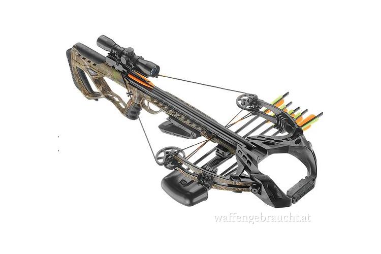 Integrierte Geräuschdämpfer reduzieren Vibrationen und Schussgeräusche deutlich und tragen so zu einem angenehmeren Schießerlebnis bei. Die Armbrust ist serienmäßig mit einem 4×32 Zielfernrohr ausgestattet, das eine präzise Zielerfassung auf mittlere und größere Distanzen ermöglicht. Für den praktischen Einsatz werden zudem Köcher, Tragegurt und 3 hochwertige Carbon‑Express‑Bolzen mitgeliefert.