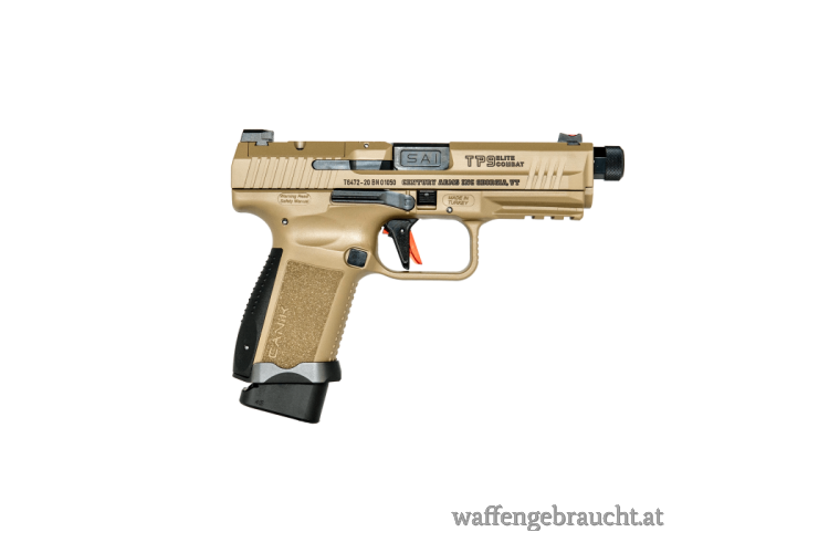 Die TP9 Elite Combat ist eine vielseitige Kompaktpistole mit Leistungsteilen, die in Zusammenarbeit mit Salient Arms International entwickelt wurden, darunter ein geriffelter und nitrierter Match-Grade-Lauf, ein Gewindeschutz, ein Visierset und ein Magazinschacht. Die kompakte Pistole hat einen Polymerrahmen, wird mit Schlagbolzen abgefeuert und verfügt über einen optikbereiten Schlitten mit vier verschiedenen Schnittstellen, um die beliebtesten Reflexvisiere des Marktes aufzunehmen. Schiebestopphebel auf beiden Seiten ermöglichen eine beidhändige Verwendung. Verlängerungen für den Magazinauslöser und alternative Rückengurte sind enthalten, um eine ideale Passform zu ermöglichen. Die Pistole enthält ein 15-Schuss-Magazin und ein 18-Schuss-Magazin mit einer +3-Aluminiumverlängerung. Die Pistole ist in 9 x 19 mm erhältlich und hat eine Cerakote-over-Tenifer-Oberfläche auf dem Schlitten für langanhaltende Korrosionsbeständigkeit. Die internen Komponenten der Zündsteuerung sind für reibungslosen Betrieb und hohe Leistung vernickelt. Ein patentiertes Holster, ein Magazinlader und ein Reinigungsset werden standardmäßig mit der Pistole geliefert.