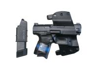 Die TP9 Elite-S Combat ist eine vielseitige Kompaktpistole mit Leistungsteilen, die von Salient Arms International in einer branchenweit ersten Zusammenarbeit entwickelt wurden, darunter ein geriffelter und nitrierter Match-Grade-Lauf, ein Glasfaservisier und ein Magazinschacht. Die kompakte Pistole hat einen Polymerrahmen, wird mit Schlagbolzen abgefeuert und verfügt über einen optikbereiten Schlitten mit vier verschiedenen Schnittstellen, um die beliebtesten Reflexvisiere des Marktes aufzunehmen. Ein mitgelieferter Spannhebel kann zum schnellen Laden auf beiden Seiten des Schlittens montiert werden. Verlängerungen für den Magazinauslöser und alternative Rückengurte sind enthalten, um eine ideale Passform zu ermöglichen. Zusätzlich zum TP9 Elite Combat verfügt das Modell Elite-S Combat über einen Sicherheitshebel am Abzugsbügel, der die Betätigung des Abzugs verhindert, wenn er eingeschaltet ist. Die Pistole enthält ein 15-Schuss-Magazin und ein 18-Schuss-Magazin mit einer +3-Aluminiumverlängerung. Die Pistole ist in 9 x 19 mm erhältlich und hat eine Cerakote-over-Tenifer-Oberfläche auf dem Schlitten für langanhaltende Korrosionsbeständigkeit. Die internen Zündsteuerungskomponenten sind für reibungslosen Betrieb und hohe Leistung vernickelt. Ein patentiertes Holster, ein Magazinlader und ein Reinigungsset sind standardmäßig im Lieferumfang enthalten.