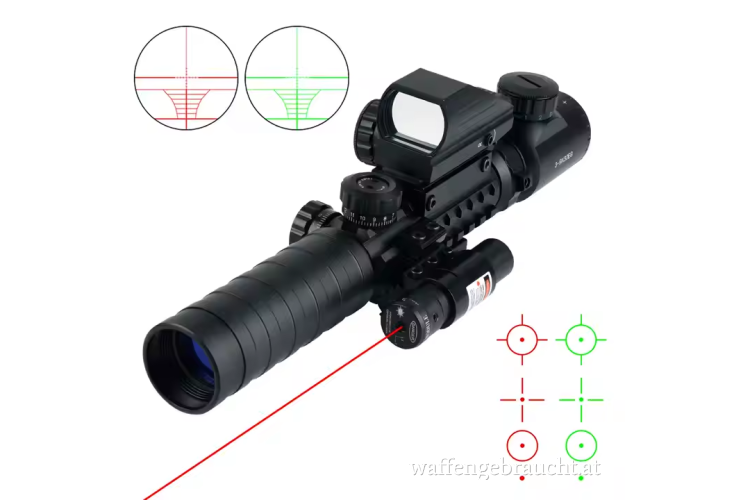 4-in-1 Design: Zielfernrohr, grüner Laser, Red Dot & Montage in einem Set