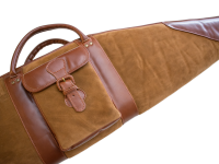 hellbraun teilweise Rauh- teilweise Glattleder zweizipp Reißverschluss. Riemen zum Umhängen seitliche Außentasche. Sehr hochwertige Ausführung. Top Preis Leistung. Geeignet für Waffen mit und ohne Zielfernrohr.