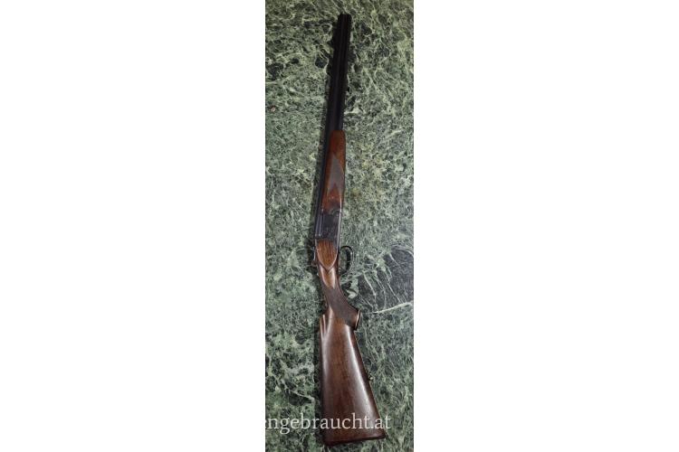 Lauflänge: 725 mm, Doppelabzug, automatische Kolbenhalssicherung, Auszieher, doppelte Laufhakenverriegelung, brüniert, einfachste jagdliche Randstich- und Arabeskengravur, Nussholzschaft, guter Zustand, Holz bei Abzug ausgebrochen, Läufe innen spiegelblank