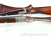 Elegantes Doppelflinten-Paar der Marke Fürstenberg im Kaliber 12/70. Sie haben beide eine Lauflänge von 76 cm und 1/4 + 3/4 Chokes. Die Flinten sind beschriftet mit I und II und weisen aufeinanderfolgende Seriennummern auf. Diese besonderen Doppelflinten werden daher nur als Pärchen verkauft. Eine passende doppelte Leder Gewehrtasche ist dabei.