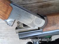 LL 65cm , glatte Laufschiene mit Klappkimme , Montiert mittels Schwenkmontage mit ZF Kahles Helia L 7x56 , Abs.7a , Französischer Stecher und Flintenabzug , Schiebesicherung am Kolbenhals , helle Basküle mit jagdlichen Szenen.