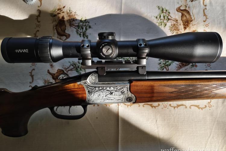 Mit einem lauflangen, vorne justierbaren Einschublauf im Kaliber 5,6x52R wurde die Waffe zum Bergstutzen hochgerüstet. Somit Hochwild und Rehwildtauglich.