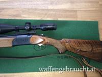 Schaft der Waffe sehr schön verarbeitet, Kugellauf mit französischen Stecher (Rückstecher). Gewehr befindet sich in einem gebrauchten guten Zustand. Inklusive fast neuer Recknagel Montage sowie dem Allrounder Zielfernrohr Kahles Helia 3 3-10x50i.