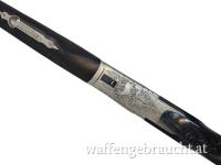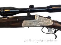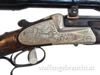 Elegante klassische Bockdoppelbüchse mit langen Seitenplatten, feiner Jagdgravur und Fingerhaken. Die Kombination aus traditioneller Büchsenmacherkunst und montiertem Swarovski 6x42 Zielfernrohr macht diese Waffe zu einer hochwertigen Jagdbüchse für anspruchsvolle Jäger.