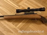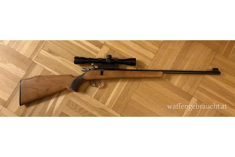 Lauflänge 49 cm, Schaftlänge 35 cm, Baujahr 1977, deutscher Beschuss, Laufbohrungszustand gut. Rampenkorn, Standvisier, 11 mm Schiene, Klemmmontage mit Zielfernrohr Tasco 4x32, seitliche Schiebesicherung, Druckpunktabzug, Nussbaumschaft mit Fischhaut und Kunststoffschaftkappe.
