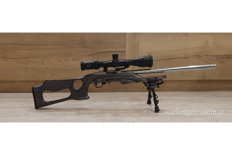 Sehr schöne Ruger 10/22 mit 20" Bull Barrel Edelstahllauf. Aufgebaut mit einem Boyds Lochschaft in grauem Schichtholz, Caldwell Zweibein und einem Helix 6-24x50 Zielfernrohr von Element Optics. Originaler grauer Schichtholzschaft ist ebenfalls inkludiert.