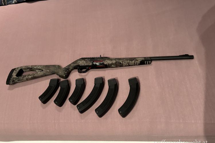 Verkauft wird eine WINCHESTER WILDCAT STRATA 22LR 16,5" MGW 1/2X28 mit 6 Magazine/ 3x25Schuss/3x15Schuss Magazine/Buttplate 2,5 cm Verlängerung Lade u Entlade Hilfe.