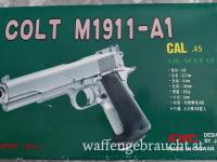 Verkaufe einen Colt M1911-A1 (AirSoft - Kaliber .45) von KWC wie auf den Bildern abgebildet. Zum Zustand der Waffe kann ich leider keine Aussagen treffen, da sie aus einem Nachlass stammt und so wie sie ist verkauft wird. Es wurde damit aber noch bis vor einem Jahr aktiv trainiert, weshalb ich annehme dass sie noch funktioniert.