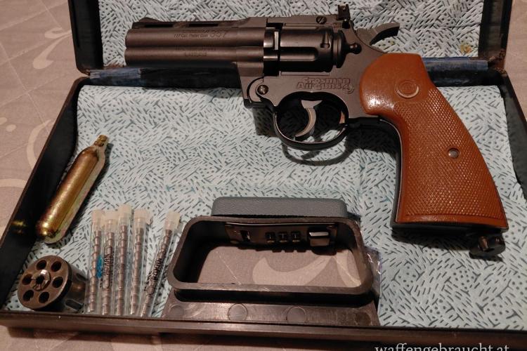 Verkaufe einen CO2-Revolver Crosman 357 im Kaliber .177/4,5mm, wie auf den Bildern abgebildet. Zum Zustand der Waffe kann ich leider keine Aussagen treffen, da sie aus einem Nachlass stammt und so wie sie ist verkauft wird. Es wurde damit aber noch bis vor einem Jahr aktiv trainiert, weshalb ich annehme dass sie noch funktioniert.