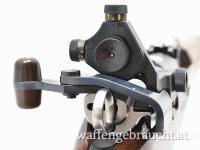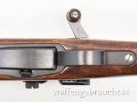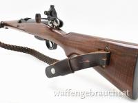 Mit Höhen- und Seiten-verstellbare W+F Dioptervisierung, Korntunnel mit Ringkorneinsatz, Verschluss mit Linksriegel Riegel kann auch abgebaut werden, Handhabe für LINKSSCHÜTZEN der Fa. G. Burgin, Basel. Nummern gleiches Bajonett. Handgeflochtenen Lederriemen. Nussbaumschaft mit eingelegter Plakette rechtsseitig.