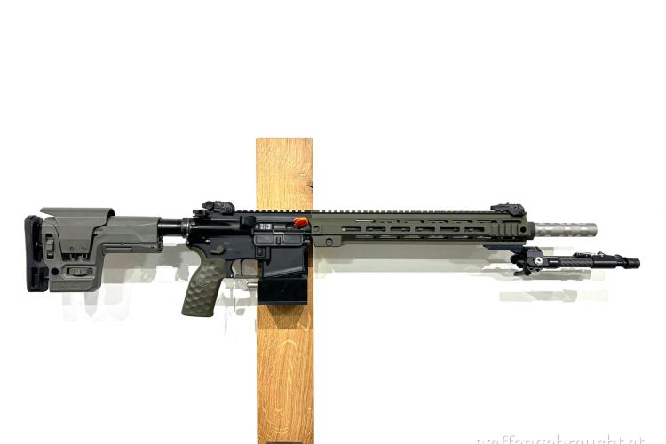 OA-15 PR SuperMatch Custom Shop Modell mit 18 Zoll Bullbarrel mit custom finish. Vorderschaft OD green Cerakote, Kunstoffteile oliv, PRS M4 Schubschaft Triggertech Competitive Matchtriger