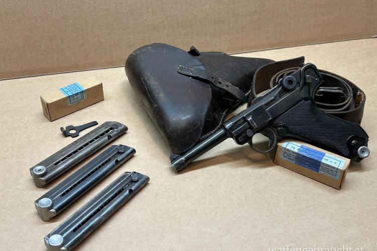 Verkaufe eine nummerngleiche P08 der Mauserwerke. Codiert mit byf41. Guter Zustand inkl. einem nummerngleichen Magazin, originaler Tasche aus 1941 (Hersteller ce?), 3 zusätzlichen Magazinen aus dem 2. WK und die 2 am Foto ersichtlichen original verpackten und noch geschlossenen Munitionspackerl.