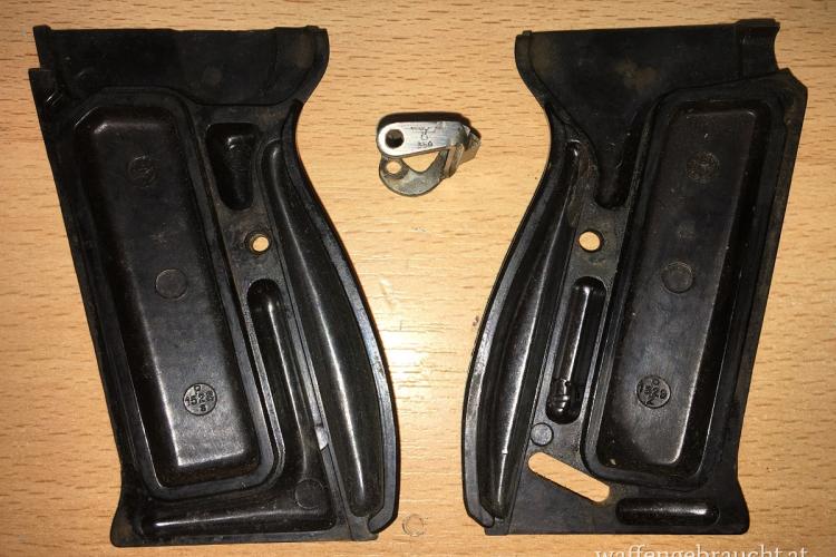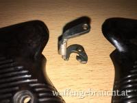 Für den ernsthaften P38-Sammler ein absolutes Muss, die experimentelle P38 Abzugsrast aus Blechprägetechnik von der Firma Walther aus dem Jahr 1940/41, in Sammlerkreisen "Horseshoe Sear" genannt. Bis Kriegsende wurden die meisten mit diesen Rasten ausgestatteten P38 wieder zurück gerüstet auf die gefräste Variante, lediglich die modifizierten Griffschalen blieben meist erhalten. Da die Rast etwas breiter war als die gefräste Variante, wurde die rechte Griffschale in diesem Bereich etwas ausgenommen. Die Rast wird nur zusammen mit den zugehörigen Griffschalen verkauft!