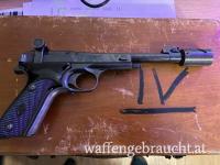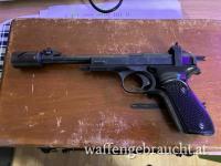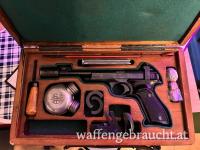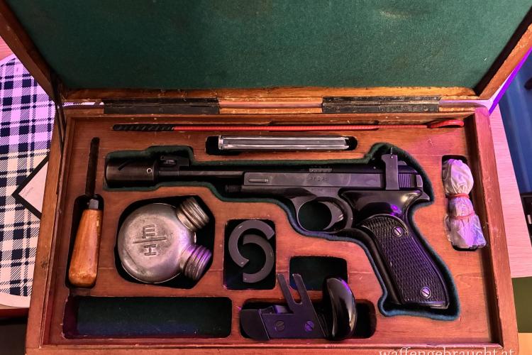 Komplett mit Original-Koffer, mit vollständigem Inhalt inkl. des Laufgewichts. Waffe ist nummerngleich, Griffauflage und beiden Magazine sind vorhanden.