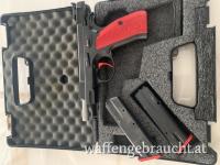 CZ 75 mit roten Alugriffschalen sowie Abzug und Magazinböden und verstellbare Visierung mit Fiberoptik.