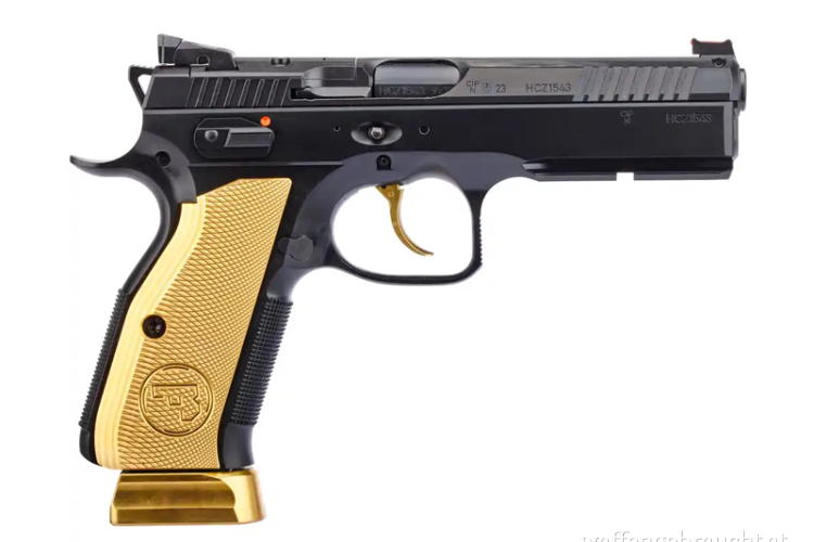 Das limitierte Sondermodell Pistole CZ SHADOW 2 OR Goldigger hat als prägnante Merkmale goldfarben beschichtete Standard-Griffschalen und Magazinböden sowie einen vergrößerten Magazinhalteknopf und Abzug. Ansonsten entspricht diese Version der CZ SHADOW 2 OR.