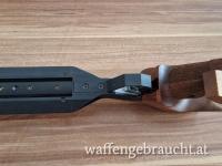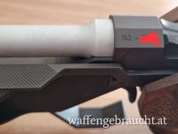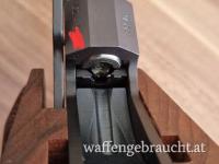 Fein justierbares Mikrovisier. Rechts am Patronenlager Firmenbezeichnung und Kaliberangabe. Links Waffennummer. Am schwarzen Kunststoffvorderschaft On/Off-Schalter des elektronischen Systems. System brüniert, ergonomische Holzgriffschalen UNVERBASTELT !!!