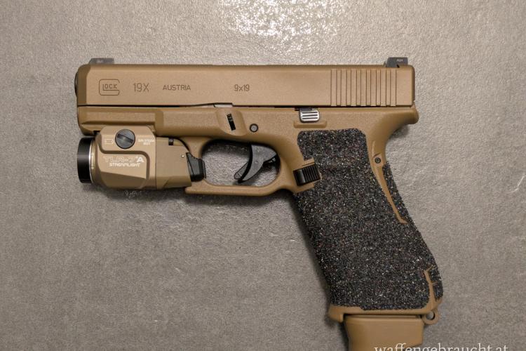 Verkaufe neuwertige Glock 19x in der Streamlight TLR7A FDE Kombination mit original Lieferumfang (3 Magazine, Koffer etc.). Original Talon Grips am Griffstück, kann man auch entfernen.