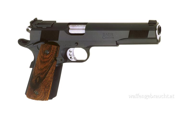 Baer 6" Matchlauf, Match-Bushing, Baer 1911 Griffstück und Schlitten, vergrößertes Auswurffenster, Aluminium-Matchabzug, Bo-Mar-Visierung, Commander de Luxe Hammer und Sear, Baer-Beavertail, beidseitige Sicherung, gecheckerte Holzgriffschalen, 30LPI-Griffstück. 8-Schuß Magazin.
