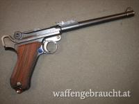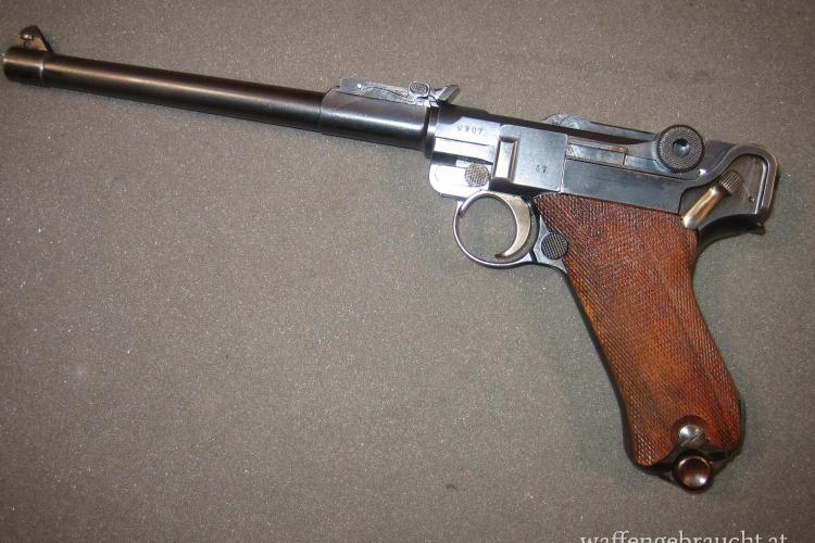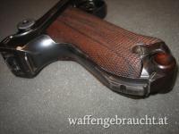 Beschreibung: P.08 Artillerie, mit Feinverstellung der Kimme und des Kornes, Holzgriffschalen der Firma K&N ( Nill), Das Magazin ist zugehörig aber nicht nummerngleich und der Patronenauszieher hat keine Nummer, ansonsten nummerngleich.
