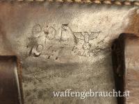 - Tasche passend zur Pistole in einwandfreiem Zustand, keine Nähte offen, Zugriemen intakt. Rückseitig gemarkt mit Hersteller "epf41", sowie passender WaA Abnahme.