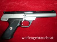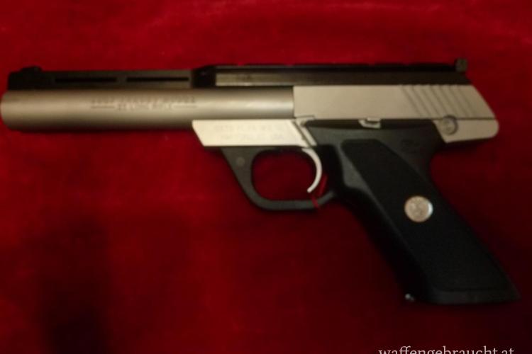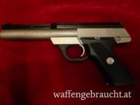Pistole, Colt, Mod.: 22 Target Model, Kal.: .22 l.r., Nr.: TM04633, Lauflänge:6", ein Magazin, matter, dicker Stainless Steel- Lauf (Bull-Barrel), höhen- und seitenverstellbares Visier, Laufschiene mit „Weaver“-Schiene, Druckknopfsicherung, Griffstück aus schwarzem Kunststoff mit Fischhaut und Firmenlogo, gebraucht, sehr guter Erhaltungszustand, der Lauf innen spiegelblank, die Metallteile stellenweise leicht abgerieben, Ferlacher Beschuß
