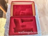Besonders vornehm ist die in Weinrot gehaltene (nummerngleiche!) Pappbox mit ebenso gefärbtem Schaumstoffeinsatz. Die gute Waffe sollte aber besser nicht darin gelagert werden.