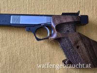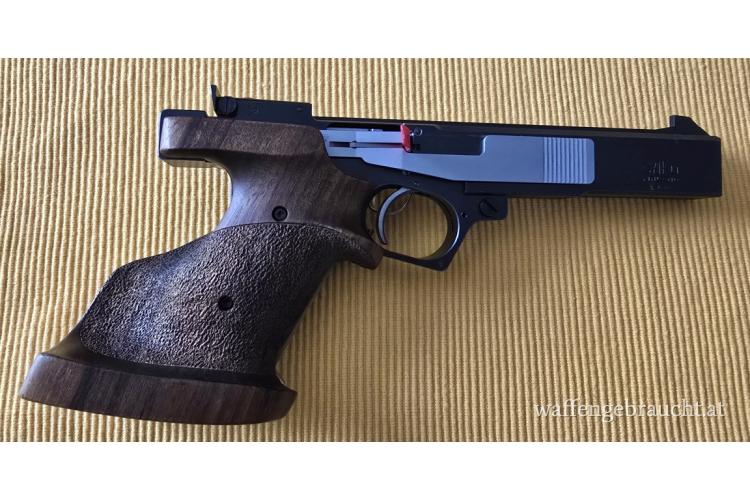 Herzeigbare, fünf schüssige Ganzstahl Sportpistole im Kaliber .22 lfB. Die Griffschalen sind nicht überarbeitet. Der Schlitten bleibt Konstruktion bedingt nach dem letzten Schuss nicht offen!