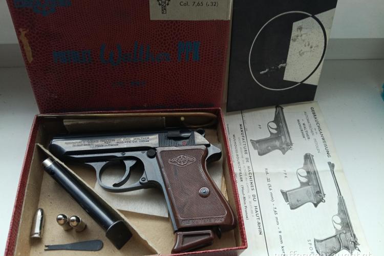 Seltene Sammlerwaffe alles gleiche Waffennummer von Waffe, Karton, Papiere, Magazine Waffennummer und zusätzlich Original mit 1 und 2 gestempelt auf der Waffe befindet sich Rechts Wahrscheinlich der Deutsche Adler beim Magazin Knopf und jeweils Links bei den Seriennummern 1 Wappen mit und ohne Krone, 2 auf den Lauf ( Bild 2 Schachtel PPK und verschiedene Teile abzugeben ) Bild 3 Alte Teile PPK aus der Kriegszeit ) Reise öfters kann Sie evt mitnehmen( suche )