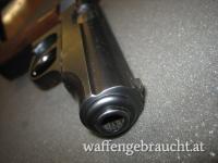 Beschreibung: Brünierte halbautomatische Vollstahlpistole SA und DA, mit offener Visierung, Visierschiene mit Wellenschliff, originales nummerngleiches Magazin,