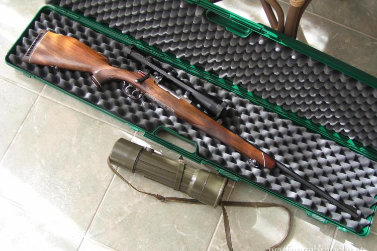 zum Verkauf steht ein Mannlicher-Schönauer M 72, Kal. 7 x 64 mit Steyr-Schwenkmontage und Glas Swarovski Habicht 4 - 12 x 50/4, inkl. Waffenkoffer und - nur bei Abholung - Restpatronen, sowie Spektiv Swarovski 30 x 75 mit Iralinvergütung.