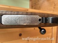 Lauflänge 60 cm, Holzklasse 4 - 5, bayrische Backe mit Schweinsrücken, Sonnenschliff auf der Kammer, Schaftlänge 36,5 cm, Flügelsicherung 45 Grad. Laufdurchmesser an der Mündung beträgt 16 mm. Die Waffen Nr. fängt mit 98 an und wurde 1998 gefertigt! Das Zielfernrohr