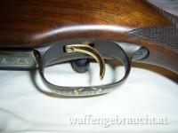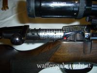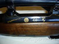 Repetiergewehr Steyr Mannlicher Luxus, Jubiläumsmodell 1934-1984, 50 Jahre Steyr Daimler Puch AG, Auflage von 200 Stück und ist die Nummer 137 davon, Lauflänge 58 cm, Kaliber 30-06, Rückstecher Abzug verstellbar, Gravuren mit Goldeinlagen, Zielfernrohr Swarovski Habicht 2.2 - 9 x 42, Absehen 4 A (feines Fadenkreuz), sehr guter Zustand da Schrankwaffe über Jahrzehnte.