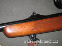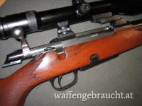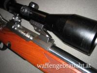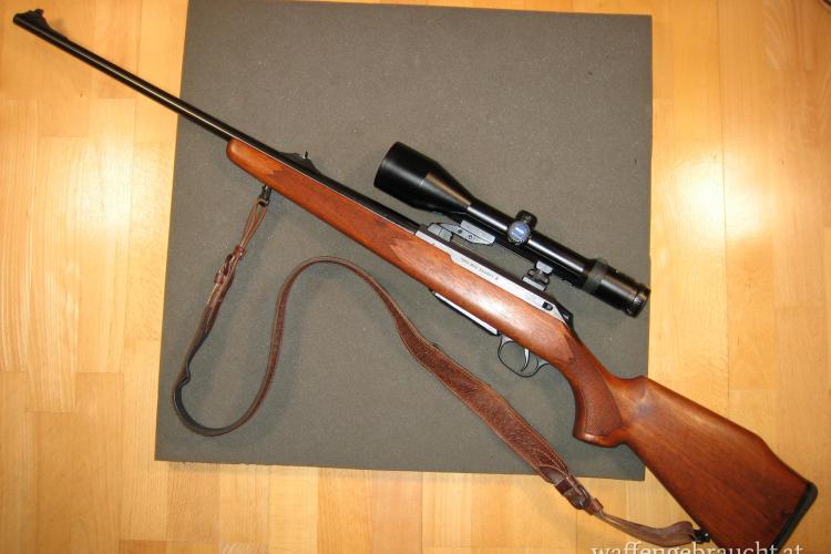 Beschreibung: Großkaliberbüchse mit Zylinderverschluss ( zwei Warzen)in sehr solider Ausführung, französicher Stecherabzug, Stahlmagazin mit Kunststoffboden, Fischhaut am Vorderschaft und Pistolengriff, Gummischaftkappe. Zeisszielfernrohr mit variabler Vergrößerung, 30mm Tubus mit Schiene, beleuchtetes Plexabsehen in der 1. Bildebene.