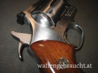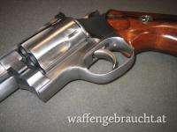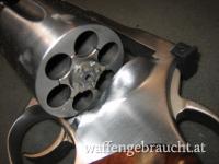 Beschreibung: SA/DA Revolver aus Stainless Steel mit Kompensator. Verstellbare Kimme, Dan Wesson Holzgriff.