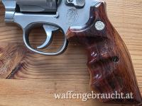 Der originale S&W Holzgriff mit Fingerrillen rundet dieses Schmuckstück ab. Ich habe die Fotos nach bestem Ermessen gemacht. Aber natürlich kann das nicht ersetzen den Revolver selber in der Hand zu halten und den Schlossgang sowie Abzug zu probieren.