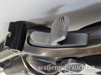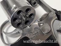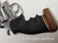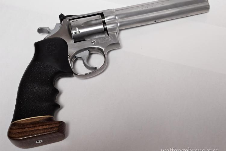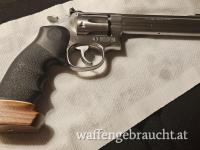 Dieses 617er Modell ist eher selten, stammt es doch als „No Dash Model“ mit 6 Zoll-Lauf aus der ersten Produktionsserie im Jahre 1989. Es ist das optimale Gegenstück zum S&W 686, aber im günstigen 22er Kaliber. Praktisch ident, gleiche Handhabung, gleiche Haptik um günstig zu trainieren. Der 6-schlüssige Revolver aus reinem Edelstahl ist in typisch guter S&W Qualität gefertigt und wiegt zusammen mit seinem aufwändigen und handfreundlichen Hogue-Sportgriff 1335 Gramm. Der Lauf ist spiegelblank. Der Schlossgang ist hervorragend , der gerillte Abzug ist deutlich und klar mit sagenhaften 1100 Gramm .