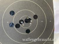 Auf der Schnellfeuerscheibe auf 15m hält er die Mouche mit normalen MagTech Patronen..