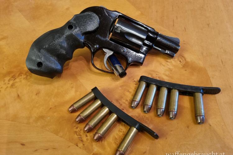 Derzeit ist ein 3D-gedruckter Griff montiert, zusätzlich ist ein Pachmayr-Gummigriff und die originalen Griffschalen aus Holz dabei.