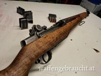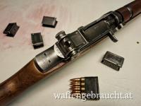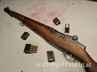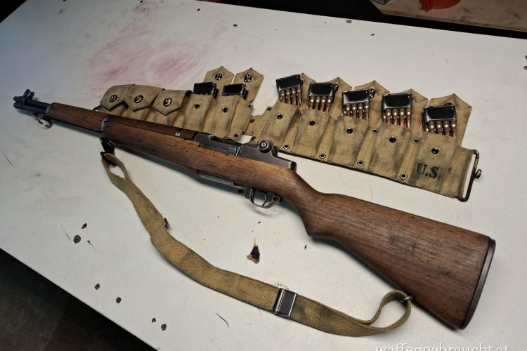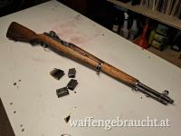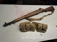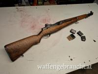 Verkaufe M1 Garand von Winchester inkl. Zubehör lt. Bilder in .308Win bzw. 7,62x51mm; Optisch wunderschön wie original aus dem 2. Weltkrieg; Technisch allerdings neuwertig; Es ist ein Bandolier mit 10 Ladeclips und das markante „Ping“ nach dem Leerschießen dieser dabei; Waffe schießt topp und hemmungsfrei; Verkaufspreis 2.800,- Euro; Waffe ist Kategorie B und wird ausschließlich nach österreichischem Recht verkauft!