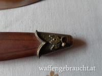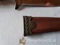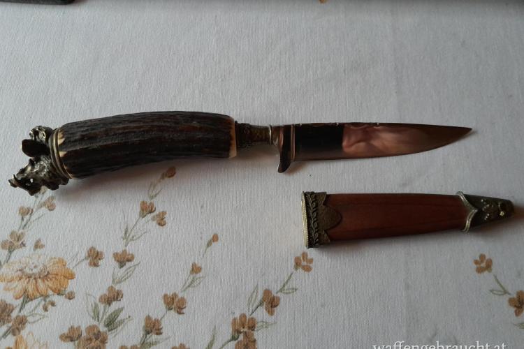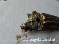 Prunkknicker mit Hirschhorngriff und Keilerkopf Messing als Abschluß, 10 cm Klingenlänge, 24 cm Gesamtlänge. Bilder folgen.