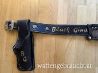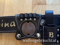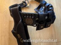 Wild Bunch Rig mit Magazinhaltern, schwarzes Leder, vielfach verziert, Holster mit eingearbeiteten Stahlblech zur Formbeständigkeit. 5 ½ Zoll Holster