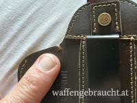 Hochwertigen, dunkelbraunen Hüft-Holster aus Leder für verdecktes Tragen und schnelles Ziehen.